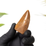 A magnificent Carcharodontosaurus Tooth, 110–94 million years old in a handmade wooden frame mounted on high-quality backing board. Common and Latin names are printed underneath including the date of the fossil.