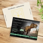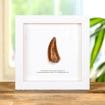 A magnificent Carcharodontosaurus Tooth, 110–94 million years old in a handmade wooden frame mounted on high-quality backing board. Common and Latin names are printed underneath including the date of the fossil.