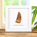A magnificent Carcharodontosaurus Tooth, 110–94 million years old in a handmade wooden frame mounted on high-quality backing board. Common and Latin names are printed underneath including the date of the fossil.
