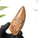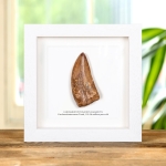 A magnificent Carcharodontosaurus Tooth, 110–94 million years old in a handmade wooden frame mounted on high-quality backing board. Common and Latin names are printed underneath including the date of the fossil.