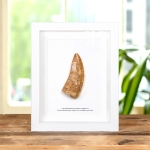 A magnificent Carcharodontosaurus Tooth, 110–94 million years old in a handmade wooden frame mounted on high-quality backing board. Common and Latin names are printed underneath including the date of the fossil.