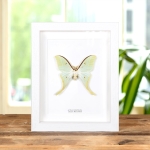 Actias ningpoana or Chinese Moon moth in a handmade wooden frame mounted underside on high-quality acid-free conservation board. The Latin and common names are printed underneath the specimen.