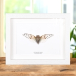 A stunning White Ghost Cicada cicada in a handmade deep wooden frame mounted on high-quality acid-free conservation board. The Latin and common names are printed underneath the specimen.