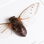 A stunning Pomponia cicada, part of the superfamily called Cicadidae, presented in a handmade deep wooden frame mounted on high-quality acid-free conservation board. The Latin and common names are printed underneath the specimen.