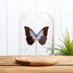 A Theseus Morpho In a glass dome with hand-made wooden base.