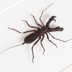 A Whip Scorpion in a handmade wooden frame mounted on high-quality acid-free conservation board. The Latin and common names are printed underneath the specimen.