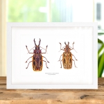 A stunning Sabertooth Longhorn beetle Male & Female Pair in a handmade wooden frame mounted on high-quality acid-free conservation board. The Latin and region names are printed underneath the specimen.