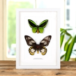 A beautiful Male and Female Cape York Birdwings butterflies in a handmade wooden frame mounted on high-quality acid-free conservation board. The Latin and common names are printed underneath the specimen.