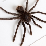 A massive Bulivian Birdeater Tarantula in a handmade wooden frame mounted on high-quality acid-free conservation board. The Latin and common names are printed underneath the specimen. Rarely available and hard to find, this size Bulivian Birdeater from South America. They belong to the Tarantula family of Theraphosidae. All Theraphoisidae are venomous, but only very few have strong enough toxins to do harm to humans but the bird eater is not part of that select group. They are known to eat insects and on occasion birds, mice and lizards.