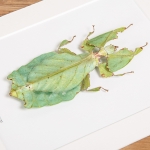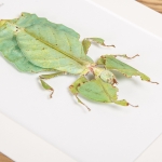 A massive Phyllium Giganteum in a handmade wooden frame mounted on high-quality acid-free conservation board. The Latin and common names are printed underneath the specimen.