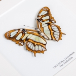 A beautiful Malachite butterfly in a handmade wooden frame mounted on high-quality acid-free conservation board. The Latin and common names are printed underneath the specimen.