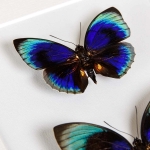 A stunning iridescent Agrias butterfly male & female pair in a handmade wooden frame mounted underside on high-quality acid-free conservation board. The Latin and common names are printed underneath the specimen.