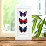 An Agrias butterfly Trio in a handmade wooden frame mounted on high-quality acid-free conservation board. The Latin and common names are printed underneath the specimen.
