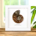 A stunning cut Ammonite fossil in a handmade wooden frame mounted on high-quality backing board. Common and Latin names are printed underneath.