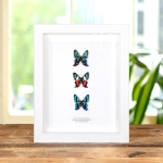 A Ancyluris trio in a handmade wooden frame mounted on high-quality acid-free conservation board. The Latin and common names are printed underneath the specimen.