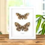 A beautiful male & female Owl moth in a handmade wooden frame mounted on high-quality acid-free conservation board. The Latin and common names are printed underneath the specimen.