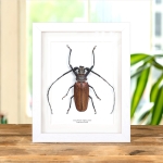 An Imperious Sawyer in a handmade wooden frame mounted on high-quality acid-free conservation board. The Latin and common names are printed underneath the specimen.