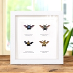 A Carpenter bee multiple specimen frame in a handmade wooden frame mounted on high-quality acid-free conservation board. The Latin and region name are printed underneath the specimen.