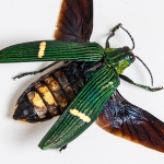 These beetles are extremely beautiful and very common. They have dark metallic green elyrea with a thick black band with yellow bands inside. It is a wood boring beetle and the adult generally emerge in June.