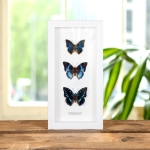 Blue Charaxes butterfly Trio in a handmade wooden frame mounted on high-quality acid-free conservation board. The Latin and common names are printed underneath the specimen.