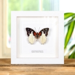 A Hadrian's White Charaxes butterfly in a handmade wooden frame mounted on high-quality acid-free conservation board. The Latin and common names are printed underneath the specimen.