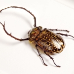 Cheirotonus gestroi live inside tree holes in forest and are very attracted to lights. The pronotum is shiny green / purple and the elytra dark with orange spots.
