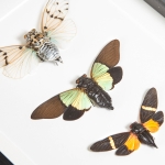 A Cicada Trio in a handmade wooden frame mounted on high-quality acid-free conservation board. The Latin and common names are printed underneath the specimen.