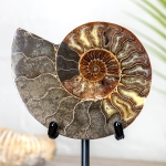 A 15.2 cm cut & polished sliced ammonite displayed on a fabricated steel stand, handmade by our Hertfordshire blacksmiths.