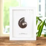A stunning cut Ammonite fossil in a handmade wooden frame mounted on high-quality backing board. Common and Latin names are printed underneath.