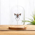 A Blue short-horned Grasshopper in a glass dome with wooden base.