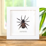 Hourglass Trapdoor Spider in a handmade wooden frame mounted on high-quality acid-free conservation board. The Latin and common names are printed underneath the specimen.