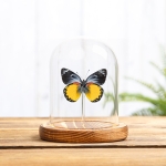 A Delias Butterfly in a handmade glass dome with your choice of brown or black wooden base. All of our domes / bell jars are handmade with fine detail in the UK meaning we have full control over the process.