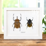 A magnificent Elephant beetle male & female pair in a handmade wooden frame mounted on high-quality acid-free conservation board. The Latin and common names are printed underneath the specimen.