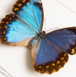 A female Anaxibia Morpho butterfly in a handmade wooden frame mounted on high-quality acid-free conservation board. The Latin and common names are printed underneath the specimen.
