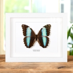 A female Deidamia Morpho in a handmade wooden frame mounted on high-quality acid-free conservation board. The Latin and common names are printed underneath the specimen.