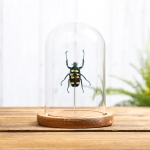 A Four Spot Flower Beetle in a handmade glass dome with your choice of brown or black wooden base. All of our domes / bell jars are handmade with fine detail in the UK meaning we have full control over the process.
