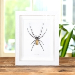 A striking Female Golden Orb-Weaver in a handmade wooden frame mounted on high-quality backing board. Common and Latin names are printed underneath.