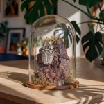 A very large Goliath beetle mounted on a piece of wood, displayed in a handmade glass dome with your choice of a black or brown wooden base.