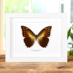 A Hercules Morpho in a handmade wooden frame mounted on high-quality acid-free conservation board. The Latin and common names are printed underneath the specimen.