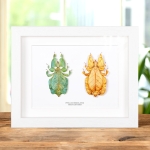 A beautiful Gray's Leaf Insect, Green & Orange pair in a handmade wooden frame mounted on high-quality acid-free conservation board. The Latin and common names are printed underneath the specimen.