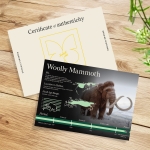 A Wooly Mammoth Tooth, Bone & Hair in a handmade wooden baroque style frame. The specimens are mounted on high quality acid free black conservation board with a black mount and striking white edge, all rounded off with baroque style corner protectors.