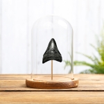 A Megalodon Tooth, 15 million years old in a handmade glass dome with your choice of brown or black wooden base. All of our domes / bell jars are handmade with fine detail in the UK meaning we have full control over the process.