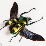 This Jumnos ruckeri has a metallic green thorax and elytra, with black wings. Also has two yellow spots / bands on the elytra. It's body can reach around 4-5 cm.
