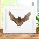 A Kuhl's Pipistrelle Bat in a handmade wooden frame mounted on high-quality acid-free conservation board. The Latin and common names are printed underneath the specimen.