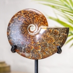 A huge 16.5 cm whole polished ammonite fossil on a hand fabricated steel stand by our UK blacksmiths.