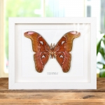 A lovely pink male Atlas moth in a handmade wooden frame mounted on high-quality acid-free conservation board. The Latin and common names are printed underneath the specimen.