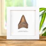 A stunning 7.6 cm brown Megalodon shark tooth fossil in a handmade wooden frame mounted on high-quality backing board. Name and age are printed underneath.
