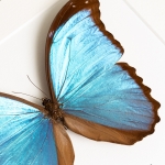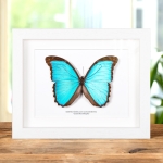 A Giant Blue Morpho in a handmade wooden frame mounted on high-quality acid-free conservation board. The Latin and common names are printed underneath the specimen.