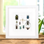 A Mixed insect display in a handmade wooden frame mounted on high-quality acid-free conservation board. The Latin and region name are printed underneath the specimen.