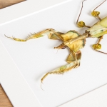 A stunning Devil's Flower Mantis in a handmade wooden frame mounted on high-quality acid-free conservation board. The Latin and common names are printed underneath the specimen.